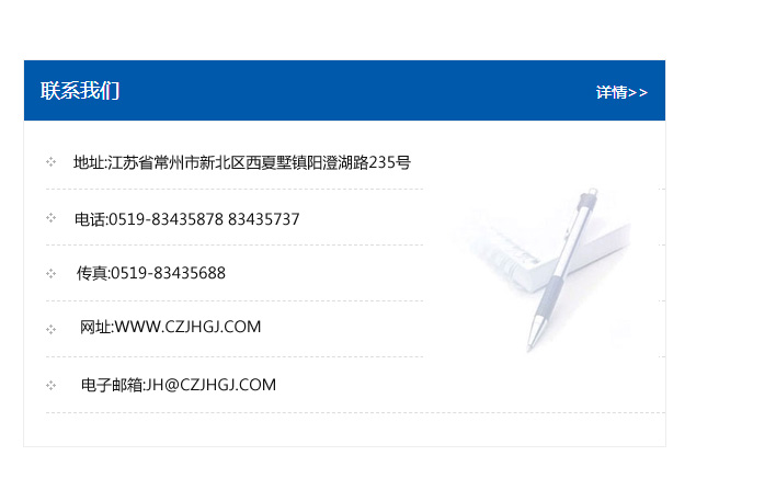 傳真:0519-83435688    郵編:213135    網址:WWW.czjhgj_com.enjoyala.com    電子郵箱:JH@czjhgj_com.enjoyala.com